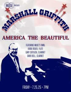 Pianist, Composer and Arranger Marshall Griffith—joined by MUSE’s own Kaira Rouer (flute), Gary Ciepluch (clarinet) and David Bell (clarinet)—rings in the summer with a concert of standards from the Great American Songbook, including works by Gershwin, Joplin, Souza, and Copland! This is a pay-what-you-can concert—there is no fixed ticket price.