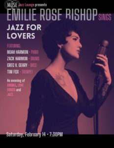 Joined by pianist Noah Harmon, drummer Zach Harmon, bassist Greg V. Geary and trumpet player Tim Fox, vocalist Emilie Rose Bishop returns to MUSE to sing Jazz For Lovers—an evening of jazz standards that celebrate Valentine’s Day and love.